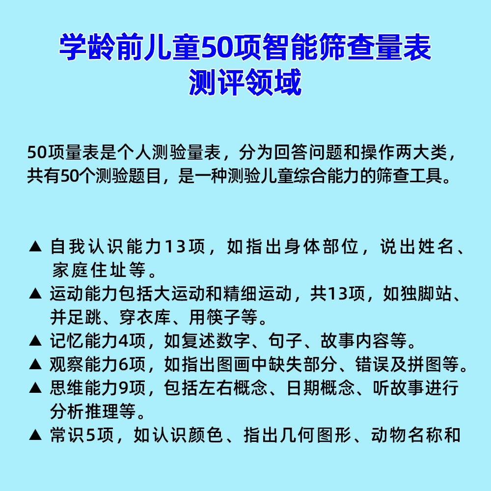 1. 學(xué)齡前兒童50項智能篩查量表工具箱小兒智力發(fā)育篩查學(xué)齡前兒童50項智能篩查量表工具箱小兒智力發(fā)育篩查學(xué)齡前兒童50項智能篩查量表工具箱小兒智力發(fā)育篩查學(xué)齡前兒童50項智能篩查量表工具箱小兒智力發(fā)育篩查學(xué)齡前兒童50項智能篩查量表工具箱小兒智力發(fā)育篩查